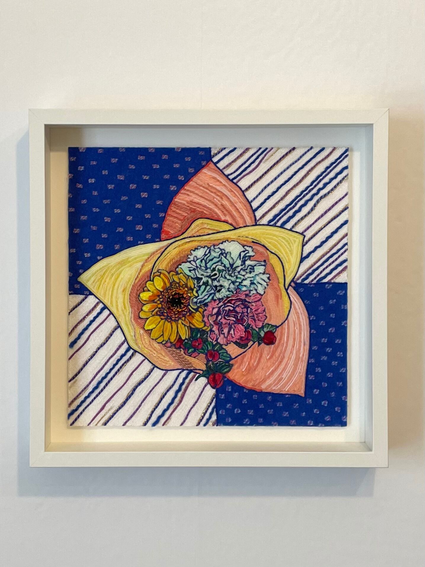 色とりどりの毛糸を使って描いた華やかな花束です。柔らかな毛糸の質感が心地よい空間を演出する優しい雰囲気の作品です。